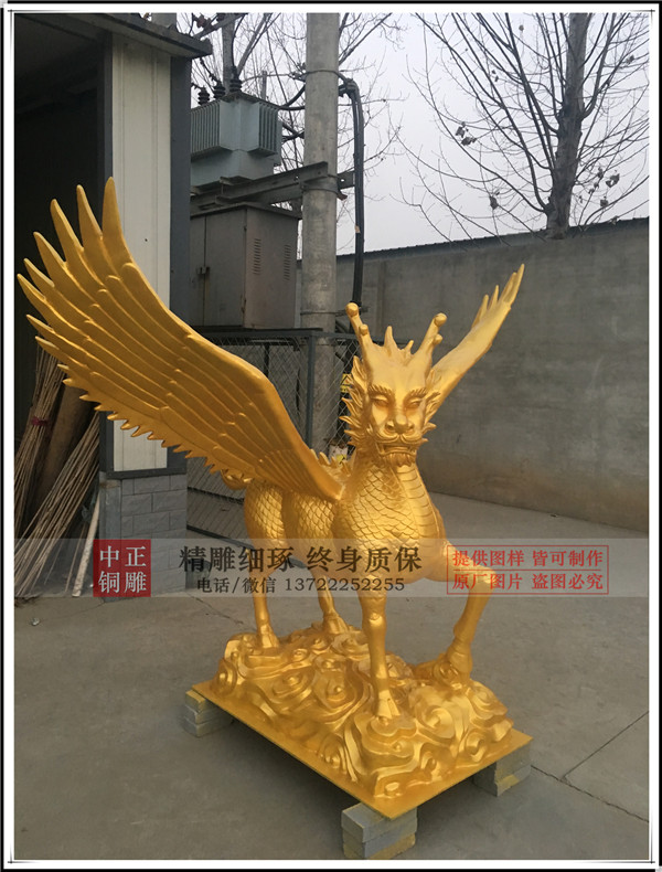 唐縣中正銅雕廠生產的帶翅膀銅麒麟安裝完畢