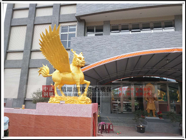 河北唐縣中正銅雕廠生產制作的鑄銅飛天麒麟,麒麟有臺灣客戶設計效果圖,我廠制作泥稿,開模,鑄銅。麒麟總高1.75米,底座高0.24米。鑄銅厚度8毫米。表面采用鈦金漆噴漆工藝,表面做氟碳漆保護。安裝于臺灣苗栗縣中天法門會場大門口。